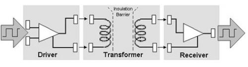 感(gan)應(ying)隔(ge)離(li)技(ji)術(shu)使(shi)用(yong)了(le)一(yi)對(dui)通(tong)過(guo)一(yi)個(ge)絕(jue)緣(yuan)層(ceng)分(fen)離(li)的(de)線(xian)圈(quan)。該(gai)絕(jue)緣(yuan)層(ceng)防(fang)止(zhi)任(ren)何(he)物(wu)理(li)信(xin)號(hao)的(de)傳(chuan)輸(shu)。信(xin)號(hao)可(ke)以(yi)通(tong)過(guo)改(gai)變(bian)流(liu)經(jing)其(qi)中(zhong)一(yi)個(ge)線(xian)圈(quan)的(de)電(dian)流(liu)進(jin)行(xing)傳(chuan)輸(shu),因(yin)為(wei)這(zhe)樣(yang)會(hui)使(shi)跨(kua)過(guo)該(gai)絕(jue)緣(yuan)層(ceng)在(zai)第(di)二(er)個(ge)線(xian)圈(quan)中(zhong)產(chan)生(sheng)類(lei)似(si)的(de)感(gan)應(ying)電(dian)流(liu)。感(gan)應(ying)隔(ge)離(li)技(ji)術(shu)可(ke)以(yi)提(ti)供(gong)與(yu)電(dian)容(rong)技(ji)術(shu)相(xiang)似(si)的(de)高(gao)速(su)傳(chuan)輸(shu)。但(dan)是(shi)由(you)於(yu)感(gan)應(ying)耦(ou)合(he)涉(she)及(ji)到(dao)用(yong)於(yu)數(shu)據(ju)傳(chuan)輸(shu)的(de)磁(ci)場(chang)的(de)使(shi)用(yong),因(yin)此(ci)它(ta)易(yi)受(shou)到(dao)外(wai)部(bu)磁(ci)場(chang)的(de)幹(gan)擾(rao)。