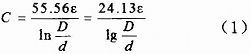 式中:C為電纜單位長度電容(pF/m);ε為絕緣介質的相對介電常數;D為電纜的外導體內徑即絕緣層外徑(mm);d為電纜的內導體外徑(mm)。