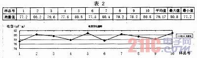 利用同軸電纜芯線電容測量裝置,測量型號為50-5芯線,各時段樣品的測量結果及變化曲線見表2。隻要在數據表(電子版)中輸入數據,就會自動繪製曲線。該圖表可以監視芯線電容的變化情況。