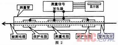 水電容測試儀由測量管、測量信號發生器、顯示器等組成(見圖2)。測(ce)量(liang)信(xin)號(hao)發(fa)生(sheng)器(qi)產(chan)生(sheng)的(de)正(zheng)弦(xian)波(bo)交(jiao)流(liu)電(dian)壓(ya)同(tong)時(shi)加(jia)到(dao)浸(jin)沒(mei)於(yu)水(shui)中(zhong)的(de)測(ce)量(liang)管(guan)中(zhong)的(de)測(ce)量(liang)電(dian)極(ji)和(he)保(bao)護(hu)電(dian)極(ji),測(ce)量(liang)電(dian)極(ji)上(shang)的(de)電(dian)流(liu)通(tong)過(guo)被(bei)測(ce)電(dian)纜(lan)的(de)電(dian)容(rong)流(liu)回(hui)電(dian)源(yuan)地(di)線(xian),在(zai)信(xin)號(hao)源(yuan)電(dian)壓(ya)和(he)頻(pin)率(lv)固(gu)定(ding)時(shi),流(liu)過(guo)電(dian)容(rong)的(de)電(dian)流(liu)與(yu)電(dian)容(rong)量(liang)大(da)小(xiao)成(cheng)正(zheng)比(bi)。