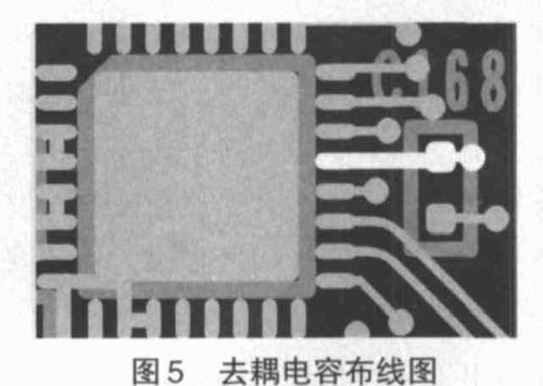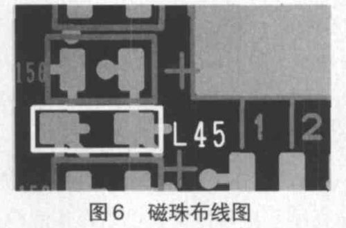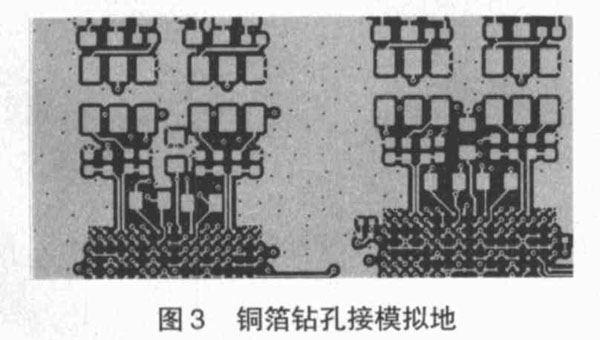 高速的A/D 混合器件在板上即器件外接的地引腳都接模擬地,電源引腳都接模擬電源,並且在電源引腳旁邊都添加去耦電容來消除高頻幹擾,如圖5 所示。跨接電源或地的磁珠電感上的線要加粗,最好多連幾根信號線鑽孔接到電源或地平麵,這樣可以減小了壓降,降低了噪聲,如圖6 所示。