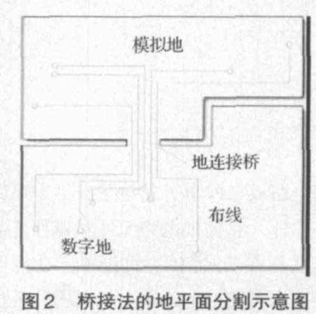 了le解jie電dian流liu回hui流liu到dao地di的de路lu徑jing和he方fang式shi是shi優you化hua混hun合he信xin號hao電dian路lu板ban設she計ji的de關guan鍵jian。如ru果guo必bi須xu對dui地di線xian層ceng進jin行xing分fen割ge,而er且qie必bi須xu通tong過guo分fen割ge之zhi間jian的de間jian隙xi布bu線xian,可ke以yi先xian在zai被bei分fen割ge的de地di之zhi間jian進jin行xing單dan點dian連lian接jie,形xing成cheng兩liang個ge地di之zhi間jian的de連lian接jie橋qiao,然ran後hou通tong過guo該gai連lian接jie橋qiao布bu線xian,如ru圖tu2 所示。