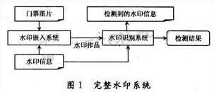 數(shu)字(zi)水(shui)印(yin)門(men)票(piao)防(fang)偽(wei)係(xi)統(tong)由(you)數(shu)字(zi)水(shui)印(yin)嵌(qian)入(ru)子(zi)係(xi)統(tong)和(he)數(shu)字(zi)水(shui)印(yin)識(shi)別(bie)子(zi)係(xi)統(tong)兩(liang)部(bu)分(fen)組(zu)成(cheng),每(mei)個(ge)子(zi)係(xi)統(tong)又(you)分(fen)別(bie)由(you)硬(ying)件(jian)與(yu)軟(ruan)件(jian)兩(liang)部(bu)分(fen)組(zu)成(cheng)。使(shi)用(yong)者(zhe)可(ke)以(yi)通(tong)過(guo)在(zai)門(men)票(piao)的(de)印(yin)刷(shua)品(pin)中(zhong)嵌(qian)入(ru)不(bu)能(neng)為(wei)肉(rou)眼(yan)覺(jiao)察(cha)且(qie)不(bu)影(ying)響(xiang)所(suo)保(bao)護(hu)印(yin)刷(shua)品(pin)原(yuan)有(you)的(de)視(shi)覺(jiao)感(gan)觀(guan)形(xing)象(xiang)的(de)數(shu)字(zi)水(shui)印(yin)密(mi)鑰(yao),並(bing)通(tong)過(guo)特(te)有(you)的(de)檢(jian)測(ce)設(she)備(bei)——機讀設備來讀取該數字水印,以鑒別印刷品的真偽,從而達到防偽目的。