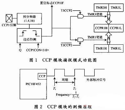 使用PIC18F452進行頻率測量的原理如圖2所示:設置CCP模mo塊kuai工gong作zuo於yu捕bu捉zhuo模mo式shi,並bing且qie讓rang它ta在zai每mei個ge上shang升sheng沿yan捕bu捉zhuo一yi次ci數shu據ju,由you相xiang鄰lin兩liang個ge上shang升sheng沿yan到dao來lai的de時shi間jian差cha就jiu可ke以yi得de到dao被bei測ce脈mai衝chong的de周zhou期qi,從cong而er也ye就jiu得de到dao了le脈mai衝chong的de頻pin率lv。