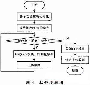 軟件的主要功能就是設置相關的功能模塊來配合硬件實現頻率的采集與數據的上傳,為了達到實時采集的目的,CCP模塊使用中斷方式進行捕捉。測頻儀與PC機采用主從式通信,PIC18F452根據PC機發來的不同指令進行相關的操作,指令共有兩種:開始采集和停止采集。當接收到“開始采集”命令時,PIC18F452就啟動CCP模塊進行頻率的測量並把測量結果通過串口上傳到PC機;當接收到“停止采集”的命令時,PIC18F452就關閉CCP模塊,同時停止上傳數據,然後繼續等待上位機的命令。測頻儀的軟件流程圖如圖4所示。
