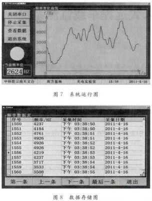 仿真通過之後,就可以按照圖3搭建硬件電路來進行硬件的運行測試。在此使用VB 6.0來編寫上位機軟件,同時配合Access數據庫來存儲PIC18F452上傳的頻率數據。係統的運行效果如圖7,圖8所示。