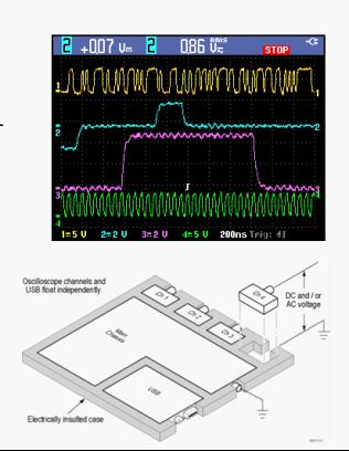 THS3000係列產品型號分為帶寬100 MHz、最大采樣率2.5 GS/s和200 MHZ、5 GS/s兩種,性能達到同類最佳。具備四個隔離通道,每通道10,000個樣點的記錄長度使用戶能夠以高采樣率捕獲大量信號信息,從而清楚地看到信號細節,快速發現信號異常。THS3000示波器上的各個通道與機身接地以及各通道相互之間是隔離的。另外,用於數據存儲、儀器設置和PC通信的外部USB輸入也是隔離的。這讓用戶能夠安全地使用隨附的10X探頭進行電壓高達300 VRMSCAT III的浮動測量,或使用可選探頭進行電壓高達1000 VRMSCAT II的浮動測量。該儀器具有600 VRMSCAT III 防護等級的輸入(BNC連接器至大地),以保證安全的高壓測量。