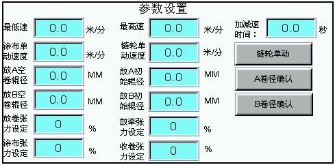 主畫麵反映了全部傳動軸的運行狀態、當前放卷卷徑、線速度,以及各個擺杆的張力角度位置等,如圖3所示。參數設置界麵提供了一些工藝參數數據等,如圖4所示。