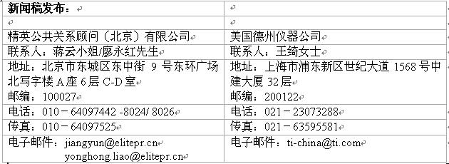 德州儀器 (TI) 半導體創新技術為未來世界開啟無限可能。攜手全球 80,000 家客戶,TI致力打造更智能、更安全、更環保、更健康以及更精彩的生活。TI把構建美好未來的承諾付諸於日常言行的點滴,從高度負責地生產半導體產品,到關愛員工、回饋社會。這一切僅是 TI 實踐承諾的開始。TI 在納斯達克交易所上市交易,交易代碼為 TXN。TI 半導體產品信息中心免費熱線電話:800-820-8682。