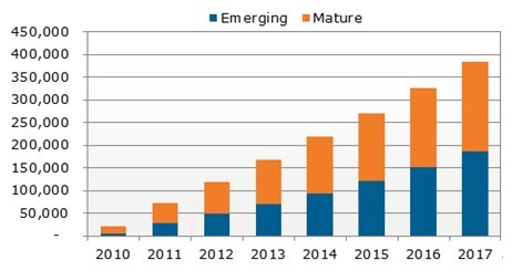 根據NPD DisplaySearch 季度平板電腦分析報告Tablet Quarterly指出,到2017年平板電腦出貨量預計將從2011年的7千270萬台上升到3億8千330萬台。如此快速成長主要源於平板電腦不僅在成熟市場穩健增長,且在新興市場的需求更是強勁。到2017年,新興市場有望占居全球平板電腦總出貨量的46%以上, 2011年的占比為36%。