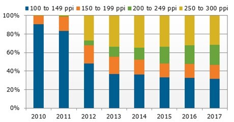 隨(sui)著(zhe)市(shi)場(chang)發(fa)展(zhan),平(ping)板(ban)電(dian)腦(nao)本(ben)身(shen)規(gui)格(ge)也(ye)不(bu)斷(duan)地(di)的(de)進(jin)步(bu)。更(geng)高(gao)的(de)像(xiang)素(su)將(jiang)使(shi)平(ping)板(ban)電(dian)腦(nao)將(jiang)具(ju)有(you)理(li)想(xiang)多(duo)媒(mei)體(ti)體(ti)驗(yan)。在(zai)接(jie)下(xia)來(lai)幾(ji)個(ge)季(ji)度(du),麵(mian)板(ban)的(de)分(fen)辨(bian)率(lv)和(he)像(xiang)素(su)將(jiang)進(jin)一(yi)步(bu)提(ti)高(gao);我們預估,2012年200-300ppi像素的滲透率將達30%,到了2017年可達到47.5%。