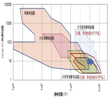 圖1:應用範圍不斷擴大的片狀獨石陶瓷電容器以額定電壓為縱軸,以靜電容量為橫軸