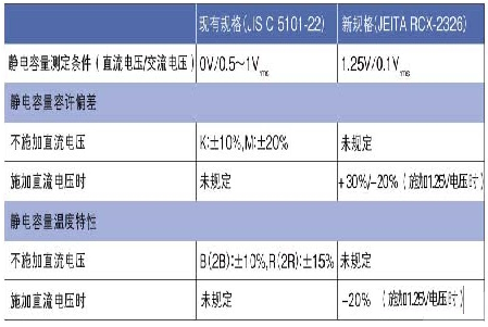 在靜電容量的測定上,新規格改為在施加1.25V直流電壓和0.1Vrms交流電壓的狀態下對容量進行測定。而原來的“JIS C 5101-22”規格並不要求施加直流電壓,隻是要求在施加0.5~1Vrms交流電壓的狀態下對容量進行測定。