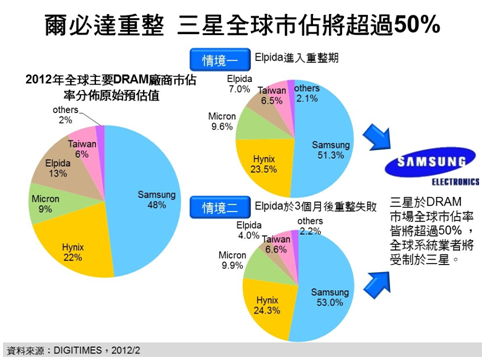 申(shen)請(qing)破(po)產(chan)保(bao)護(hu)一(yi)舉(ju)雖(sui)為(wei)爾(er)必(bi)達(da)防(fang)止(zhi)資(zi)金(jin)鏈(lian)立(li)即(ji)斷(duan)裂(lie)的(de)緩(huan)兵(bing)之(zhi)計(ji),然(ran)而(er),無(wu)論(lun)爾(er)必(bi)達(da)能(neng)否(fou)重(zhong)整(zheng)成(cheng)功(gong),此(ci)舉(ju)將(jiang)會(hui)對(dui)爾(er)必(bi)達(da)未(wei)來(lai)銷(xiao)售(shou)與(yu)市(shi)占(zhan)率(lv)造(zao)成(cheng)不(bu)利(li)影(ying)響(xiang),亦(yi)會(hui)對(dui)全(quan)球(qiu)DRAM產業版圖造成變化。柴煥欣認為,最顯著影響即為2012年三星於全球DRAM市場市占率將有可能因此超過50%,不僅會讓三星對全球DRAM市場價格變化影響力提升,讓其它DRAM業者麵臨苦戰外,同時亦會讓如華碩、宏碁等係統業者於DRAM成本受製於三星。