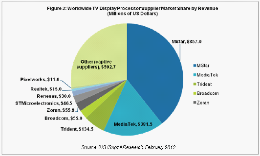 據IHS iSuppli公司的顯示電子專題報告,憑借與中國大陸廠商的緊密關係和清晰的產品策略,台灣半導體芯片供應商晨星與聯發科2011年幾乎完全統治了電視視頻處理器市場,而包括英特爾在內的幾家廠商則認負出局。