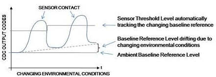 保持可靠性能。容性傳感器電極是采用PCB上的標準銅材料或柔性材料製成的。這種材料的特性會隨溫度和濕度的變化而發生改變。這種變化會使基線電平發生偏移(所有傳感器閾值電平均是以基線電平為參考的)。較大的基線偏移增加了接觸閾值電平過低或過高的風險(過低還是過高取決於基線偏移的方向)這zhe會hui引yin起qi虛xu假jia的de接jie觸chu誤wu差cha,或huo使shi閾yu值zhi電dian平ping不bu是shi太tai靈ling敏min就jiu是shi不bu夠gou靈ling敏min,導dao致zhi接jie觸chu狀zhuang態tai的de不bu穩wen定ding。為wei保bao持chi傳chuan感gan器qi原yuan始shi的de信xin號hao接jie觸chu閾yu值zhi檢jian測ce電dian平ping餘yu量liang(靈敏度),CDC需要自動跟蹤基線偏移誤差的幅度,並對閾值設置進行相應的重新調整。圖2中的示例介紹了AD7147和AD7148的閾值電平如何針對因環境條件變化引起的基線失調變化進行自動跟蹤和調整。