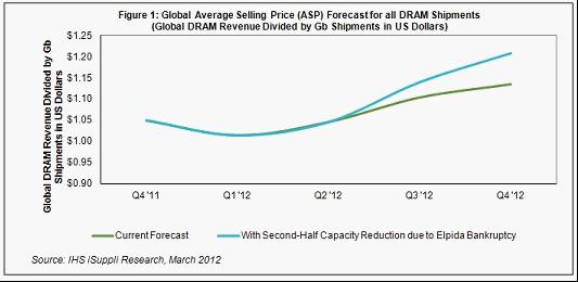 如果爾必達的產能減少逾25%,則到2012年底,所有DRAM出貨量的全球平均銷售價格(ASP)預計上升到1.21美元,比上半年末的1.05美元上漲15.5%,如圖1所示。如果不是破產導致產能大減,今年底價格將上升到1.13美元,隻比上半年末的水平高出8.5%。