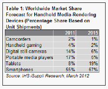 據IHS iSuppli公司的消費平台專題報告,憑借多種多樣的功能與特點,智能手機和平板電腦等多用產品將繼續侵蝕數碼相機等其它專用消費電子產品的銷售,最終在2015年導致這些傳統的媒體再現(media-rendering)設備市場永久衰落。