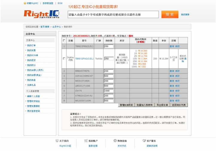 圖1:RightIC網站BOM單批量查詢功能的詢價頁麵。
