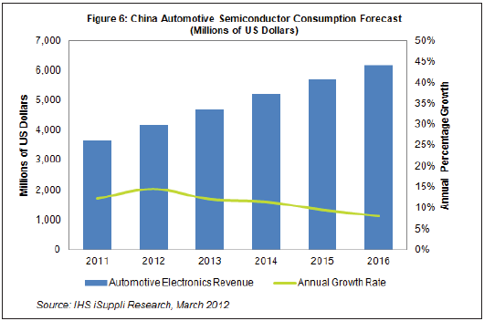 中國汽車半導體市場過去幾年快速增長,2010年中國汽車半導體消費額銳增58%,達到32億yi美mei元yuan。中zhong國guo汽qi車che需xu求qiu旺wang盛sheng,而er中zhong國guo消xiao費fei者zhe收shou入ru增zeng加jia和he政zheng府fu刺ci激ji政zheng策ce幫bang助zhu提ti高gao了le汽qi車che銷xiao量liang,這zhe些xie因yin素su都dou有you利li於yu中zhong國guo汽qi車che電dian子zi市shi場chang的de擴kuo張zhang。