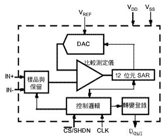 在本方塊圖中,取樣/保持、比較器、大部份的數字模擬轉換器及12位SAR都是模擬;其(qi)餘(yu)電(dian)路(lu)部(bu)份(fen)是(shi)數(shu)字(zi)。結(jie)果(guo),本(ben)轉(zhuan)換(huan)器(qi)內(nei)之(zhi)模(mo)擬(ni)電(dian)路(lu)耗(hao)用(yong)大(da)部(bu)份(fen)的(de)電(dian)源(yuan)與(yu)電(dian)流(liu),除(chu)數(shu)字(zi)模(mo)擬(ni)轉(zhuan)換(huan)器(qi)與(yu)接(jie)口(kou)中(zhong)發(fa)生(sheng)的(de)小(xiao)量(liang)切(qie)換(huan)電(dian)流(liu)外(wai),數(shu)字(zi)電(dian)路(lu)的(de)消(xiao)耗(hao)電(dian)流(liu)極(ji)少(shao)。
