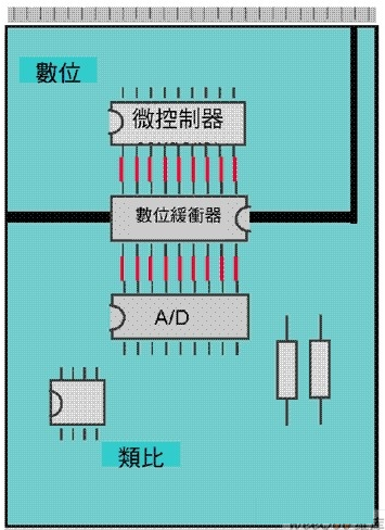 圖注: 使用高分辨率 SAR 模(mo)擬(ni)數(shu)字(zi)轉(zhuan)換(huan)器(qi),轉(zhuan)換(huan)器(qi)電(dian)源(yuan)與(yu)接(jie)地(di)應(ying)連(lian)接(jie)至(zhi)模(mo)擬(ni)麵(mian)。模(mo)擬(ni)數(shu)字(zi)轉(zhuan)換(huan)器(qi)的(de)數(shu)字(zi)輸(shu)出(chu)應(ying)有(you)緩(huan)衝(chong)器(qi),使(shi)用(yong)外(wai)部(bu)三(san)態(tai)輸(shu)出(chu)緩(huan)衝(chong)器(qi)。這(zhe)些(xie)緩(huan)衝(chong)器(qi)隔(ge)開(kai)模(mo)擬(ni)麵(mian)與(yu)數(shu)字(zi)麵(mian),並(bing)提(ti)供(gong)高(gao)驅(qu)動(dong)能(neng)力(li)。