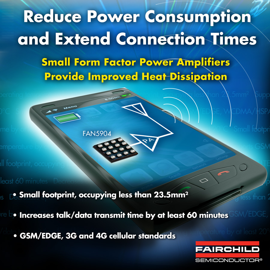 作為正在實施的便攜產品計劃的一部分,飛兆半導體通過與客戶密切合作開發出FAN5904器件,這是一款支持GSM/GPRS/EDGE、3G/3.5G 和4G功率放大器(PA)的大功率高效同步降壓轉換器,能夠降低無線便攜設備的功耗,將連通時間延長60分鍾以上。FAN5904具有小於23.5 mm2的占位麵積,還能夠在維持射頻性能的同時,將功率放大器的工作溫度降低至少20ºC。