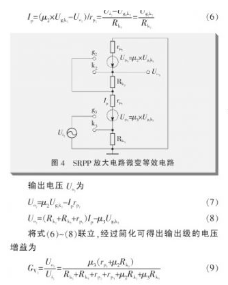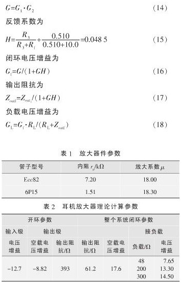 輸入級放大器件選用Ecc82雙三極管,輸出級選用6P15,基本參數如表1所示。為降低輸出阻抗,以便於和阻抗較低的耳機相匹配,輸出級SRPP電路采用雙管並聯的方式工作。放大器的相關參數計算方法如下所示,其中開環電壓增益為: