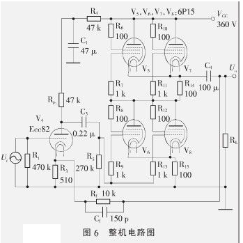 輸出級采用SRPP電路,電子管既可選擇內阻合適的三極管,如6N6,E182CC,也可選擇用於功放的小功率五極管,如6P15,6P14,EL42,EL91,EL84,EL86。