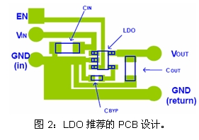 如在TCXO(溫度補償晶振)電源中,其隻需要5mA的負載電流,Vout固定,若能控製Vin的值僅稍大於Vout+Vdrop,(一般地,CMOS LDO的Vdrop在Iout=5mA條件下,其值為5mV~10mV),則LDO的自身功耗Pd在不到1mW,這取決於方案設計工程師在應用電路中的設計。