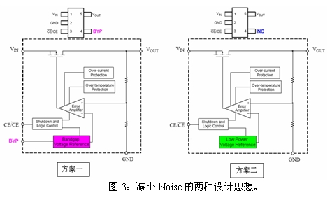 方案一中,如不加bypass電容,CMOS LDO的噪聲一般在200~450uVrms(沒有負載時的電源電流越小,這個噪聲越大),加了這個電容濾波後,LDO的噪聲一般為30~50 uVrms,因此方案一的低噪聲CMOS LDO都是有這個Bypass腳,並且是必須加這個濾波電容才能做到低噪聲。