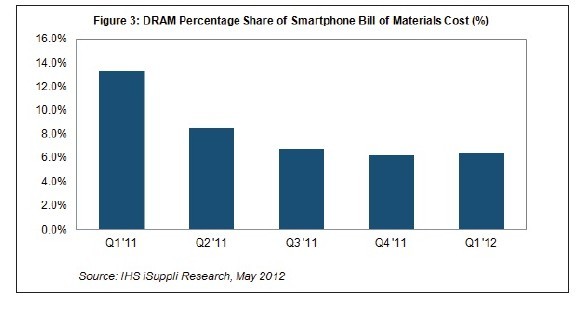 據IHS iSuppli公司的DRAM動態簡報,雖然智能手機的材料清單(BOM)成本穩步上升,但一年來DRAM在其中所占的份額卻下降了一半以上,主要是因為DRAM價格下跌。