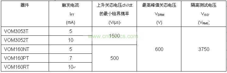 VOM3052T和VOM3053T具有高達1500V/μs的靜態dV/dt,尤其適用於噪聲環境。在這些地方,即使在輸入端沒有任何觸發信號,由於在輸出負載上存在高擺率瞬態,較低的dV/dt可能引起晶閘管觸發。