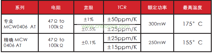 MCW 0406 AT 精密係列具有 250 mW 額定功率,電阻溫度係數 (TCR) 下降到 ±15ppm/K,容差為 ±0.1%。
