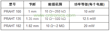 PRAHT係列的節距為1mm、1.35mm或1.82mm,阻值為10Ω~2MΩ,每個電阻的功率等級為10mW~20mW。器件具有小於-35dB的低噪聲,電壓係數小於0.01ppm/V。符合RoHS的電阻網絡提供工作溫度可達+230℃的金端接,或溫度為+200℃的SnAg端接。