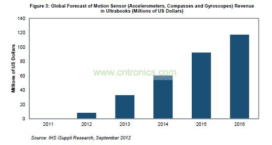 在超級本的帶動下,包括加速計、陀螺儀和羅盤在內的運動傳感器的全球銷售額到2016年將達到1.173億美元,而2012年隻有830萬美元,2012-2016年的複合年度增長率高達93.9%,如圖所示。