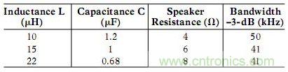 常見的濾波器設計選擇目的是為了在所需要的最高音頻頻率條件下將濾波器響應下降減至最小以獲得最低帶寬。如果對於高達20 kHz頻率,要求下降小於1 dB,則要求典型的濾波器具有40 kHz巴特沃斯(Butterworth)響應(以達到最大平坦通帶)。對於常見的揚聲器阻抗以及標準的L值和C值,下表給出了標稱元器件值及其相應的近似Butterworth響應: