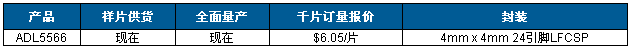 ADL5566采用ADI公司的高速SiGe工藝製造,提供緊湊型4 mm × 4 mm、24引腳LFCSP封裝,工作溫度範圍為−40°C至+85°C。
