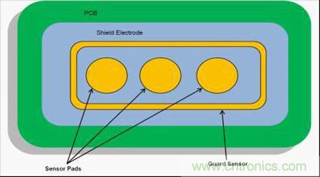 因yin電dian容rong式shi感gan應ying鈕niu令ling家jia電dian外wai觀guan時shi尚shang,避bi免mian磨mo損sun問wen題ti,因yin此ci,相xiang對dui機ji械xie按an鈕niu成cheng為wei了le首shou選xuan技ji術shu。許xu多duo家jia電dian要yao在zai液ye體ti附fu近jin使shi用yong,需xu要yao有you防fang水shui功gong能neng,以yi免mian有you水shui情qing況kuang下xia造zao成cheng假jia觸chu發fa。圖tu1顯示了電容式傳感器印刷電路板(PCB)的典型布局。將圍繞傳感器(藍色)的交叉網格(hatched pattern)連接至保護電極(而不是接地)就可實現防水功能。