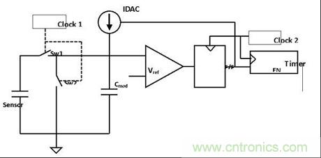 通過在GND和VREF(內部生成)之間切換傳感器,隻要在器件規定的工作範圍內,電源的任何變化都不會造成假觸發。圖2顯示了傳感器電容在集成電容(Cmod)電壓和GND之間用兩個非重疊時鍾Sw1和Sw2切換時的技術實施情況。電路比較器的輸出通過觸發器作為定時器的使能信號,並通過調節電源來確保Cmod電壓與參考電壓(Vref)相同。由於輸入端上的任何信號都就n個時鍾周期求積分(n取決於分辨率),因此耦合到輸入端上的任何高頻噪聲都會通過積分效果被平均。