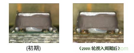 磁性樹脂和鼓芯都沒有看見裂紋產生。另外,電氣特征的變化也控製在±1%以內。-40℃⇔+105℃的環境下外觀上沒有任何的破壞,並且電氣特征保持穩定,這使其成為了能夠滿足車載用電子元器件性能要求的產品。