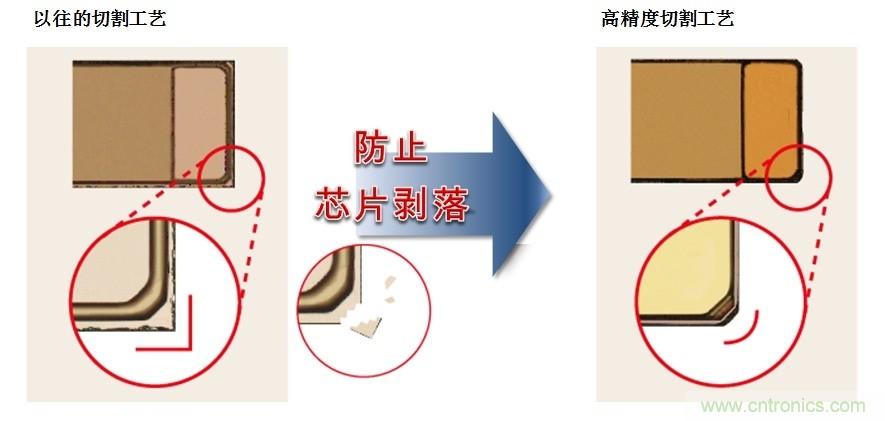 ROHM通過采用與以往不同的、獨創的微細化技術,在開發製造係統的同時,改進切割方法,在切割工藝上將封裝尺寸公差大幅降至±10μm。通過提高尺寸精度,消除毛刺和碎片,有助於減少貼裝時的吸著誤差以及提高貼裝精度。