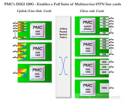 PMC的DIGI 120G是一款功能強大的100G OTN處理器,設計初衷是實現下一代光傳送網絡。DIGI 120G提供了高度靈活的平台,使得OEM可以設計範圍廣泛的OTN解決方案,其中包括用於OTN交換的高密度線卡以及功能強大的用於P-OTN的混合OTN/分組線卡。DIGI 120G的獨特性在於: