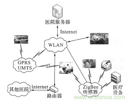 係統中包括無線個人網絡(wireless person2al area network,WPAN ) 、ZigBee網絡以及一係列醫療監護網絡的醫療傳感器節點。本係統具有良好的擴展性,例如醫護人員在急救途中或在其他醫院可以分別利用WLAN /UMTS網關和互聯網與係統進行信息交互。