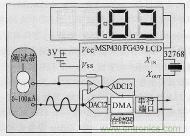 醫療傳感器節點框圖如圖2 所示,主要包括醫療傳感器模塊、ZigBee 通信模塊、處理器單元和電源4 部分。處理器單元如圖3 所示,主要分為CPU、存儲器、AD 轉換、測試帶和數碼顯示屏5 部分。根據低功耗和處理能力的需要,采用TI公司的MSP430 係列單片機,存儲器部分主要用於存儲傳感器所采集的臨時數據,在處理器將數據傳輸之後,傳感器節點內不做數據的大量存儲。