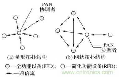 星形網絡結構的通信是以FFD作為PAN協調者完成與設備之間的通信,在該網絡中PAN協調者的功能是初始化網絡、中止和路由信息。星形網絡廣泛應用於自動化家居、個人醫療監護係統和醫院病房等小區域。