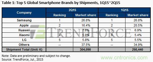 2015年Q2全球智能手機出貨量3.04億部,三星銷量第一