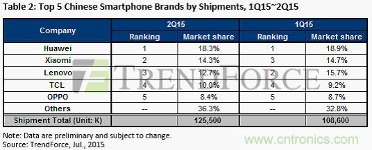 【導讀】近日,市場研究機構TrendForce發布2015年度第二季度全球智能手機報告。中國的華為明顯獨領風騷。數據顯示,三星雖然從蘋果手裏奪回第一的寶座,但是,Q1和Q2 幾乎毫無變化。蘋果的市場份額則一調再掉,從Q1的20.5%掉到Q2的15.4%。華為的市場份額增加了7%,小米的份額增加了5%。