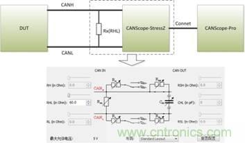 由此可見,該方法雖然可以大致測量出CAN節jie點dian的de差cha分fen電dian平ping位wei信xin號hao特te征zheng,但dan由you於yu其qi用yong於yu做zuo分fen析xi的de樣yang本ben很hen少shao,測ce量liang方fang式shi有you很hen難nan操cao作zuo,所suo以yi為wei了le提ti高gao測ce量liang結jie果guo的de準zhun確que度du,減jian低di人ren工gong成cheng本ben,文wen章zhang中zhong對dui測ce試shi方fang法fa進jin行xing了le改gai進jin,使shi用yongCANScope-Pro總線分析儀、CANScope-StressZ擴展板,使用配套軟件的樣眼圖與對稱性測試進行測量。