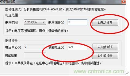 注意:由於GMW3122規定CANH+CANL的電壓要在4.2V~5.8V,而正常為5V。所以在采用對稱性測試時,其中使用的是(CANH+CANL)/2進行判別。 所以標準範圍為2.1V~2.9V,正常為2.5V。因此圖7中誤差電壓需要填入0.4。